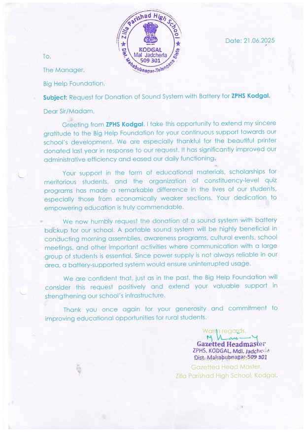 Head Master of Zilla Parishad High School, Kodugal, Mahaboobnagar District, Telangana requested to Bighelp to donate a Sound system for their School.
