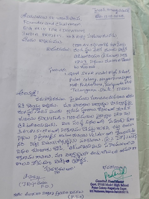 Head Master of SVAR Govt. Model High School, Pylon colony, Nagarjunasagar, Nalgonda district requested Bighelp to construct an auditorium at their School.