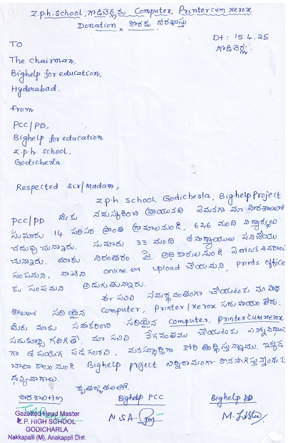 Head Master of Zilla Parishad High School, Godicherla, Anakapalli district, AP requested Bighelp to donate Computer and Printer to their school.