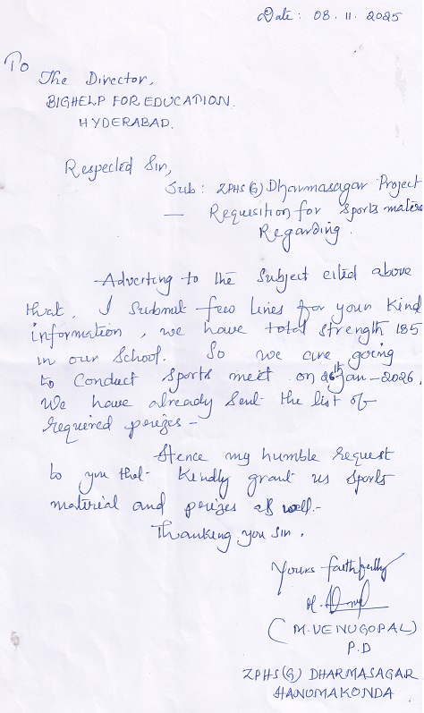 Head Master of Zilla Parishad Girls High School, Dharmasagar, Warangal district, Telangana requested Bighelp to provide sports material to their school. The present strength of the school is 185.