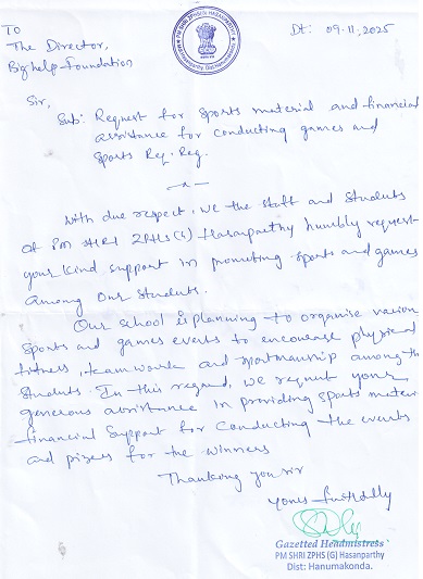 | Head Mistress of Zilla Parishad Girls High School, Hasanparthy, Warangal district, Telangana requested Bighelp to provide sports material to their school for organizing various sports and games events to physical fitness, team work and sportsmanship among the students. |