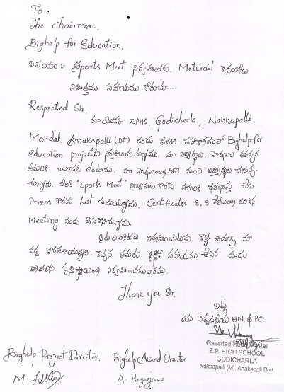 Head Master of Zilla Parishad High School, Godicherla, Anakapalli district, AP requested Bighelp to provide sports material to their school for organizing various sports and games events to physical fitness, team work and sportsmanship among the students. Present strength of the school is 569 students.