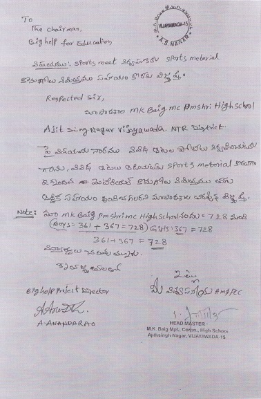Head Master of M.K. Baig MNC High School, Vijayawada, NTR district, AP requested Bighelp to provide sports material to their school for organizing various sports and games events to physical fitness, team work and sportsmanship among the students. Present strength of the school is 728 students.