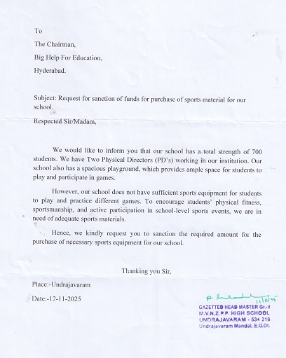 | Head Master of Zilla Parishad High School, Undrajavaram, West Godavari district, AP requested Bighelp to provide sports material to their school for organizing various sports and games events to physical fitness, team work and sportsmanship among the students. |