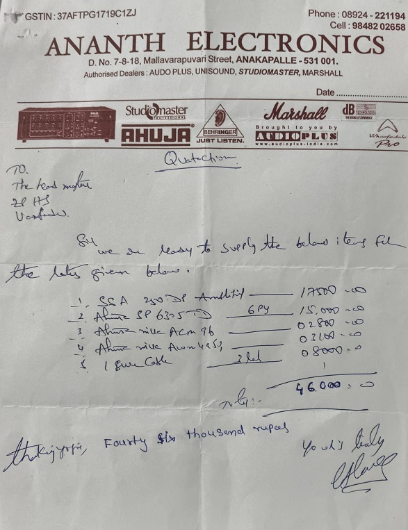Head Master of Zilla Parishad High School, Vempadu, Anakapalli District, AP requested to Bighelp to donate a Sound system for their School.