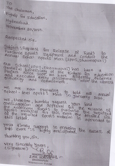 | Head Master of Zilla Parishad High School, Dharmapuri, Vizianagaram district, AP requested Bighelp to provide sports material to their school for organizing various sports and games events to physical fitness, team work and sportsmanship among the students. |