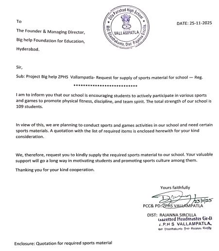 Head Master of Zilla Parishad High School, Vallampatla, Rajanna Siricilla district, Telangana requested Bighelp to provide sports material to their school for organizing various sports and games events to physical fitness, team work and sportsmanship among the students. Present strength of the school is 109 students.