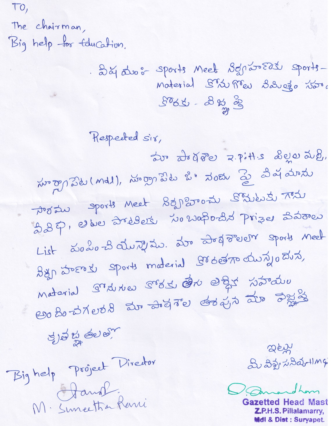 The Head Master of Zilla Parishad High School, Pillalamarry, Suryapet district, Telangana, has requested Bighelp to provide sports material to their school for organizing various sports and games events aimed at promoting physical fitness, teamwork, and sportsmanship among the students.