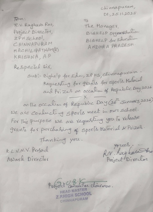 | Head Master of Zilla Parishad High School, Chinnapuram, Krishna district, AP requested Bighelp to provide sports material to their school for organizing various sports and games events to physical fitness, team work and sportsmanship among the students. |