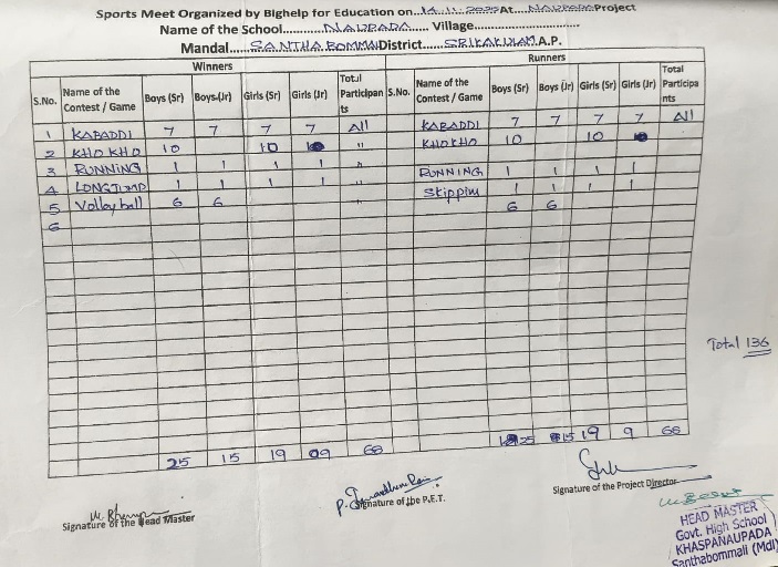 Bighelp believes in fostering team spirit and leadership qualities through physical fitness as an integral part of education. In line with this vision, Bighelp conducts sports meets every year on 15th August, 14th November, and 26th January across all its project-run schools. The complete details of the games conducted are provided below.