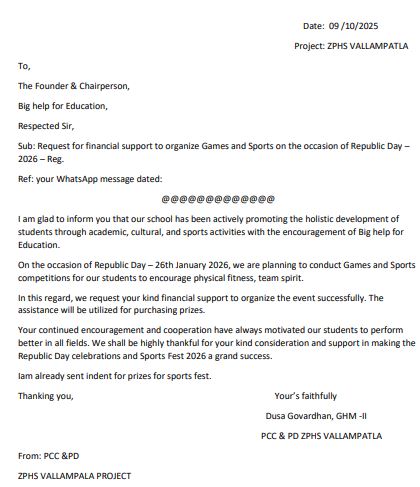 | Bighelp organized a sports meet for the students of Vallampatla Zilla Parishad High School on 26th January 2026, with the objective of promoting physical fitness, endurance, and overall well-being among students. |