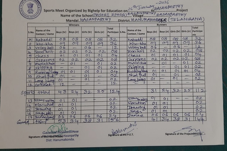 | Bighelp organized a sports meet for the students of Hasanparthy Zilla Parishad Girls High School on 26th January 2026, with the objective of promoting physical fitness, endurance, and overall well-being among students. |