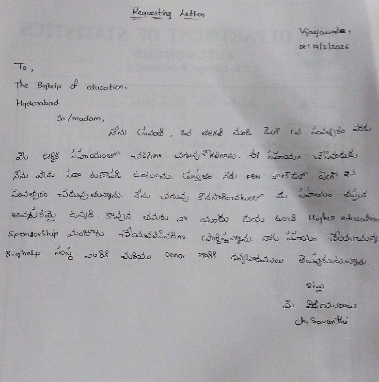 | Bighelp thanks Satheesh & Manjula Donthy for kindly sponsoring the education of Sravanthi Chintada. |