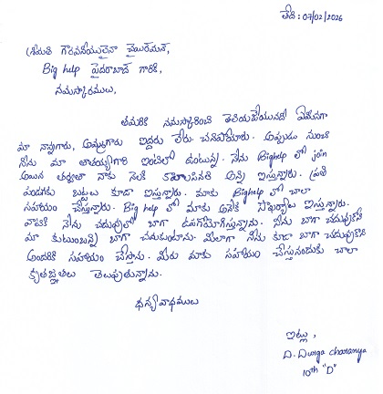 | Bighelp thanks Praveen Nuthulapati for kindly sponsoring the education of Durga Charanya Dakarapu. |