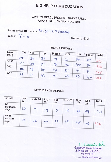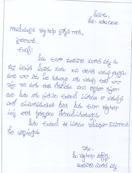 | Bighelp thanks Aruna Thummepalli & Srinivas Jidge for kindly sponsoring the education of Yogith Varma Mandapati. |