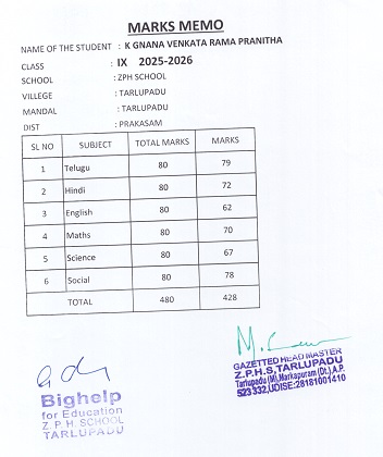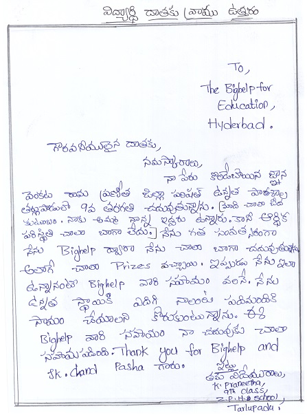 | Bighelp thanks Ravindra Babu Koneru for kindly sponsoring the education of Gnana Venkata Rama Praneetha Kondeboina. |