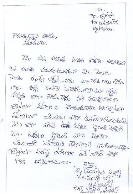 Bighelp thanks Manoj Kumar Eswarappa for kindly sponsoring the education of Venkata Jhansi Lakshmi Velugu.