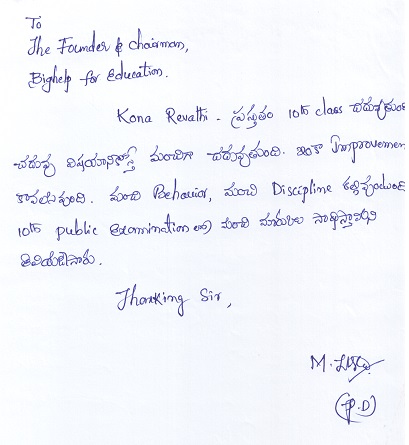 | Bighelp thanks Anand B Bachina for kindly sponsoring the education of Revathi Kona. |