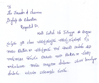 | Bighelp thanks Chandrasekhar Seelam for kindly sponsoring the education of Sathish Kolli. |