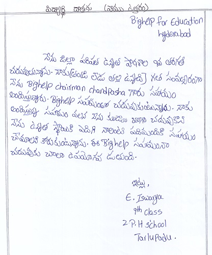 Bighelp thanks Pavan Kancherlapalli for kindly sponsoring the education of Iswarya Erla.