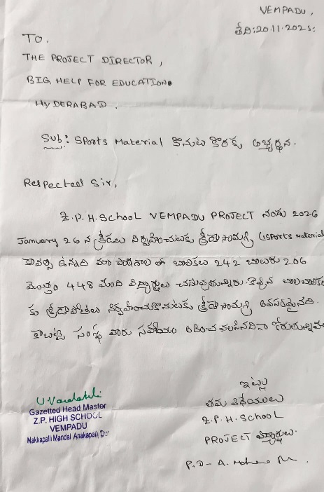 | Head Master of Zilla Parishad High School, Vempadu, Anakapalli district, AP requested Bighelp to provide sports material to their school for organizing various sports and games events to physical fitness, team work and sportsmanship among the students. Present strength of the school is 448 students |