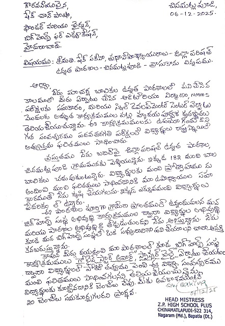 | Head Mistress of Zilla Parishad Girls High School, Chinamatlapudi, Nagaram Mandal, Bapatla district, AP requested to donate duel desks for their school. Estimated cost for this project is Rs. 1,00,000/- |