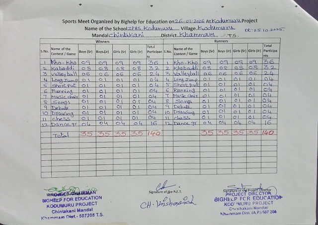 | Bighelp organized a sports meet for the students of Kodumuru Zilla Parishad High School on 26th January 2026, with the objective of promoting physical fitness, endurance, and overall well-being among students. |